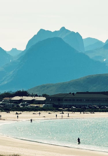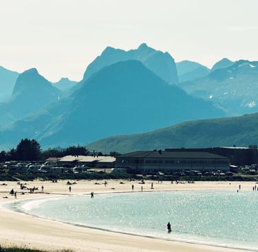 Plaże Haukland i Uttakleiv: Idealne na spacery i zdjęcia, z turkusową wodą i miękkim, białym piaskiem. Możliwość kąpieli w morzu dla odważnych lub trekking w pobliskich górach.