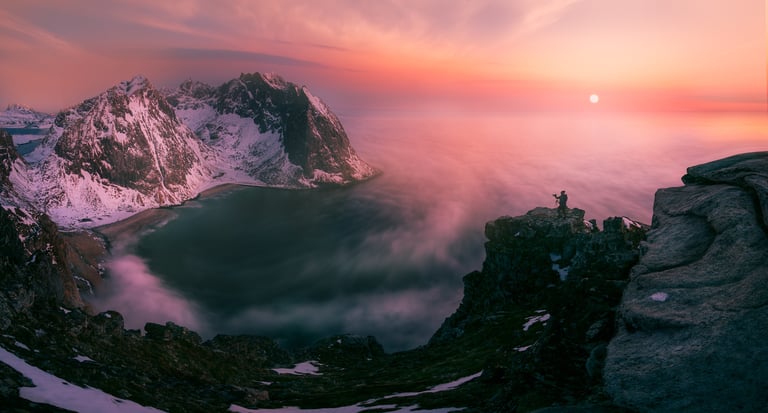 Podczas jeden z moich wizyt na Lofotach wybrałem się na wędrówkę na szczyt góry Ryten, aby podziwiać widoki na plażę Kvalvika. Gdy dotarłem na szczyt, słońce zaczęło zachodzić, a niebo przybrało niesamowite odcienie pomarańczu, różu i purpury. Użyłem statywu, aby ustabilizować aparat i przeprowadzić długą ekspozycję, co pozwoliło mi uchwycić nie tylko kolory nieba, ale również rozmyć wodę i fale uderzające o brzeg. To doświadczenie pokazało mi, jak kluczowe jest planowanie sesji zdjęciowej oraz jak ważne jest, aby być w odpowiednim miejscu o odpowiedniej porze. Zdjęcie poniżej zostało wykonane techniką panoramowania.